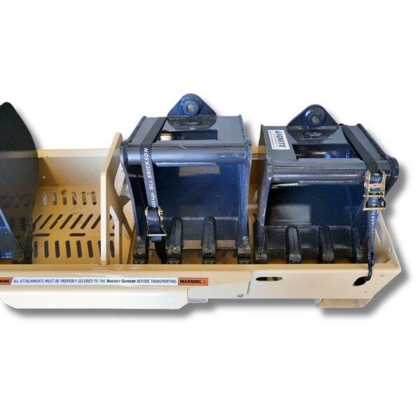 EX-Series rack for 2-ton mini excavators. Carries multiple buckets + tools in one compact 300 lb rack. Includes bucket hook + blade mount.