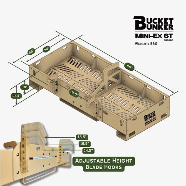 Expanded EX-Series rack for 6-ton excavators. 660 lb rack with 100″ x 36″ storage bed. Carries oversized buckets + tools, with bucket hook + blade mount.